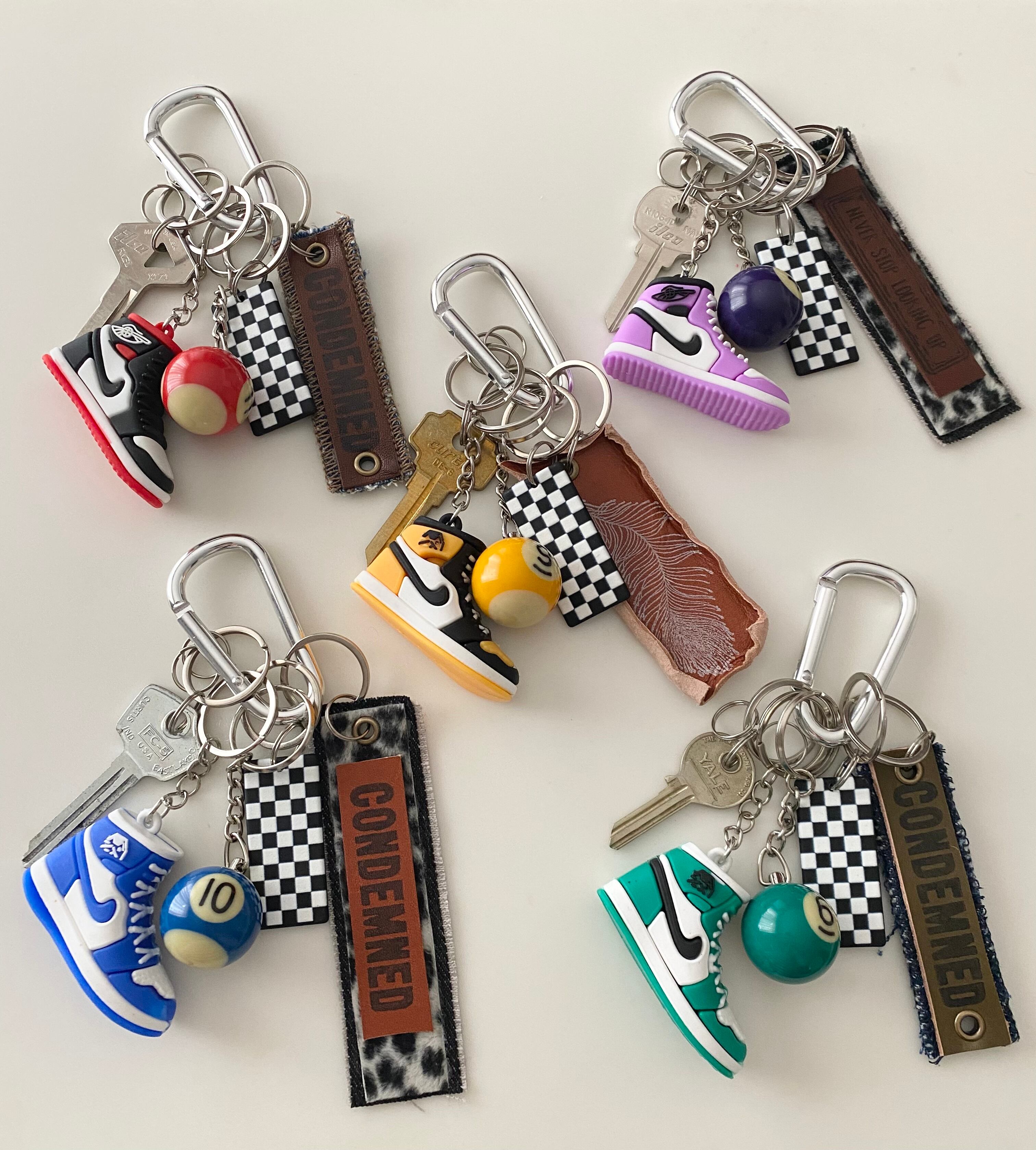 味のあるレザータグと8ボール、ジャンクキー、ラバースニーカーをキーリングにしました。
